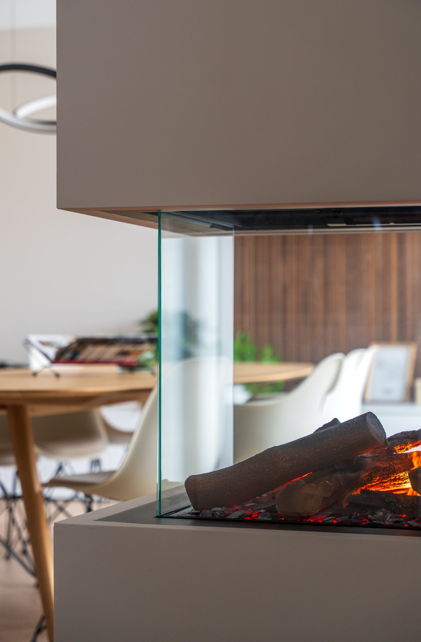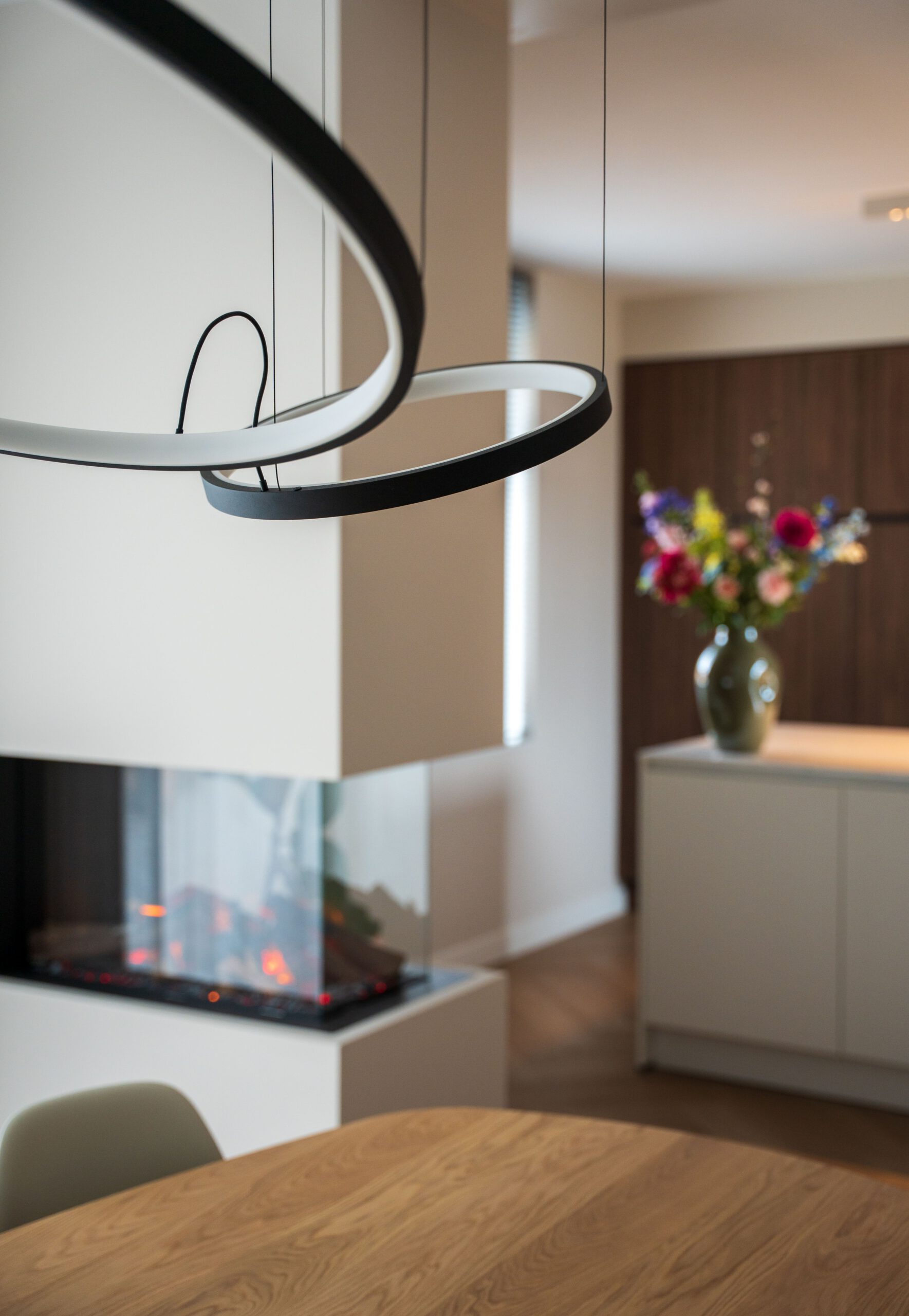 Een roomdivider kan echt een eyecatcher zijn en tegelijkertijd zorgen voor rust, structuur en een natuurlijke scheiding tussen ruimtes. In deze woning hebben we de divider gecombineerd met een elektrische haard. Het hebben van een haard stond op het ‘nice to have’ lijstje van de bewoners, dus toen ik een divider ging intekenen om de grote keuken meer diepte te geven en knusser te maken, maakte de haard het plaatje compleet.