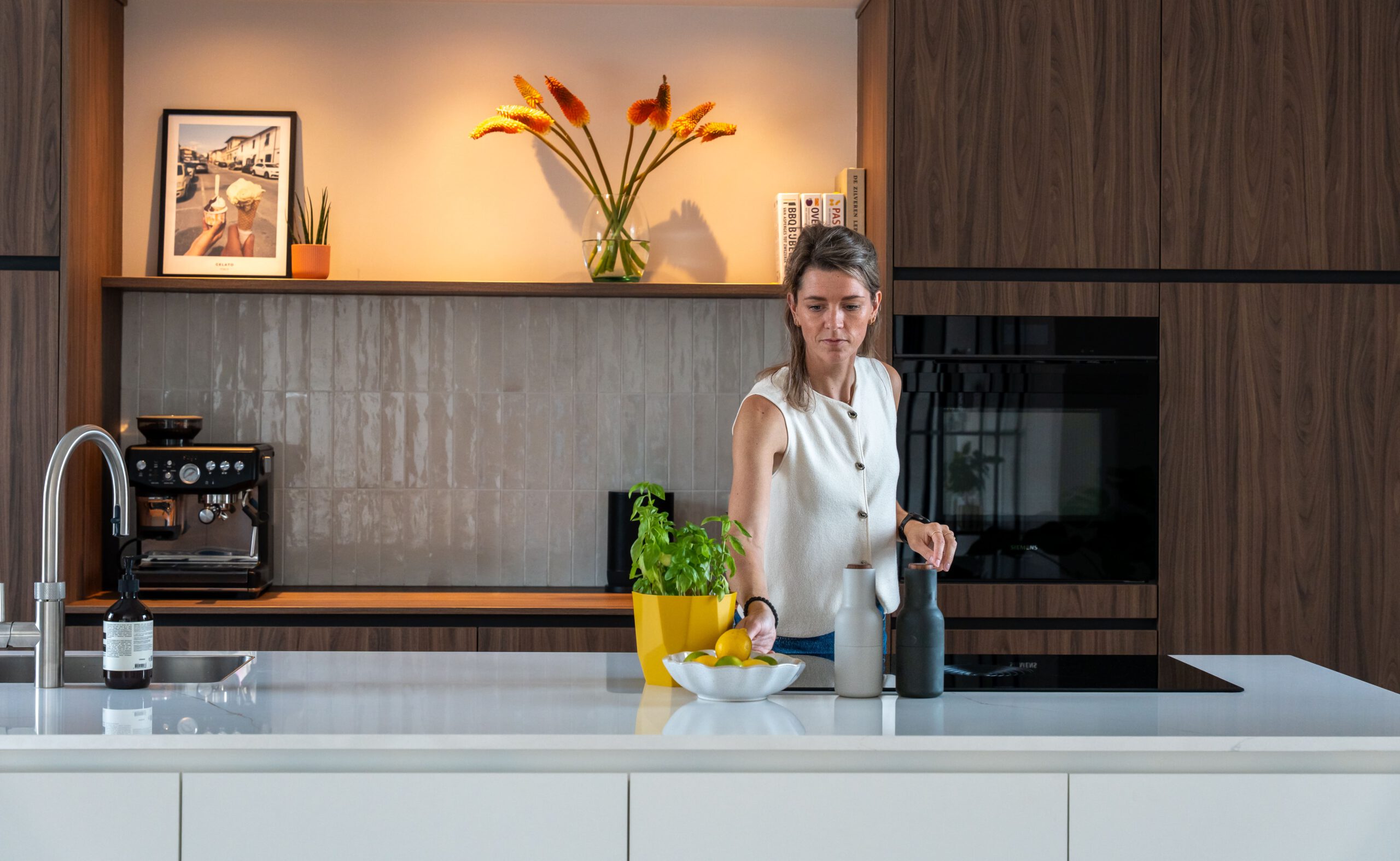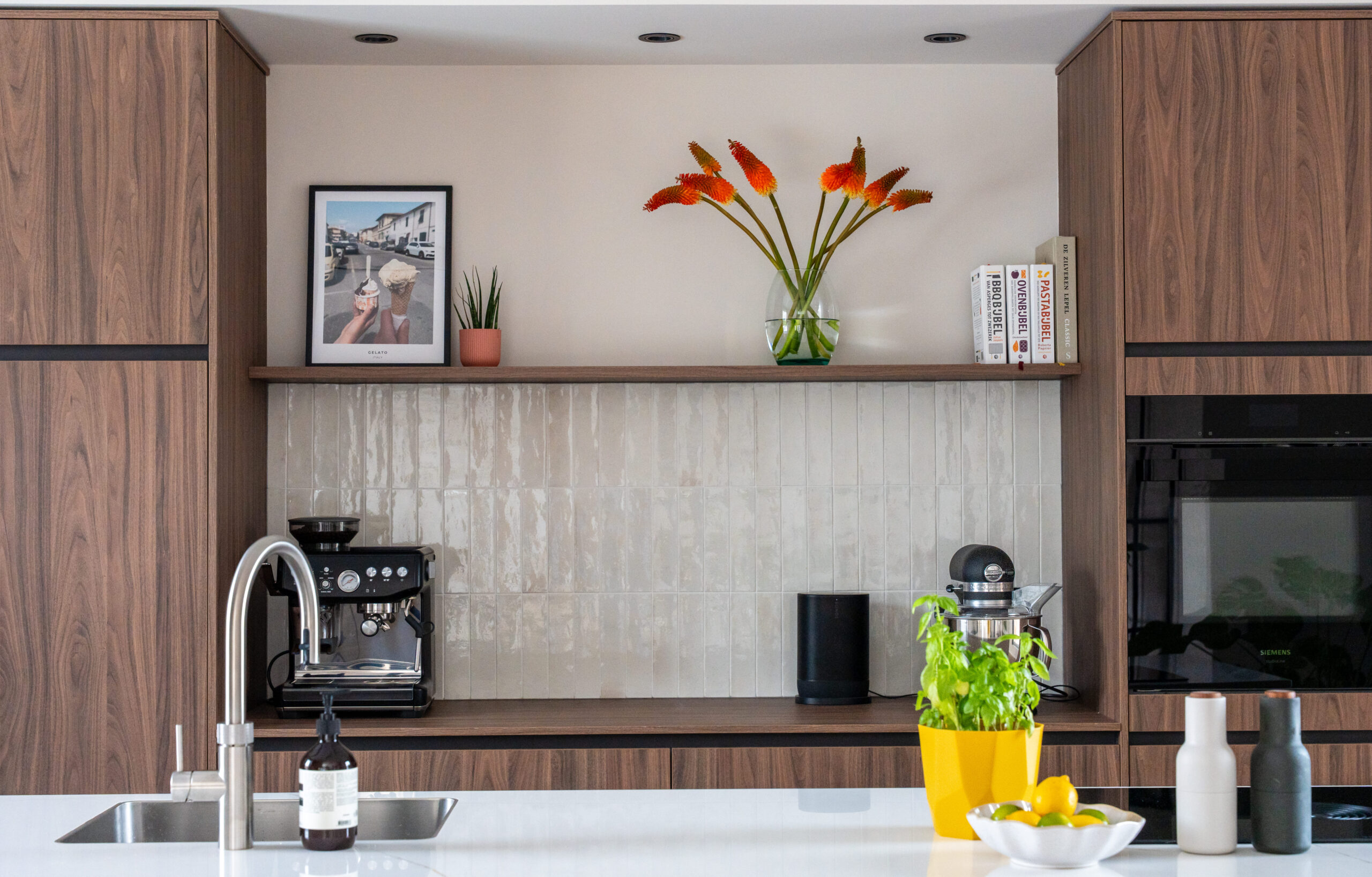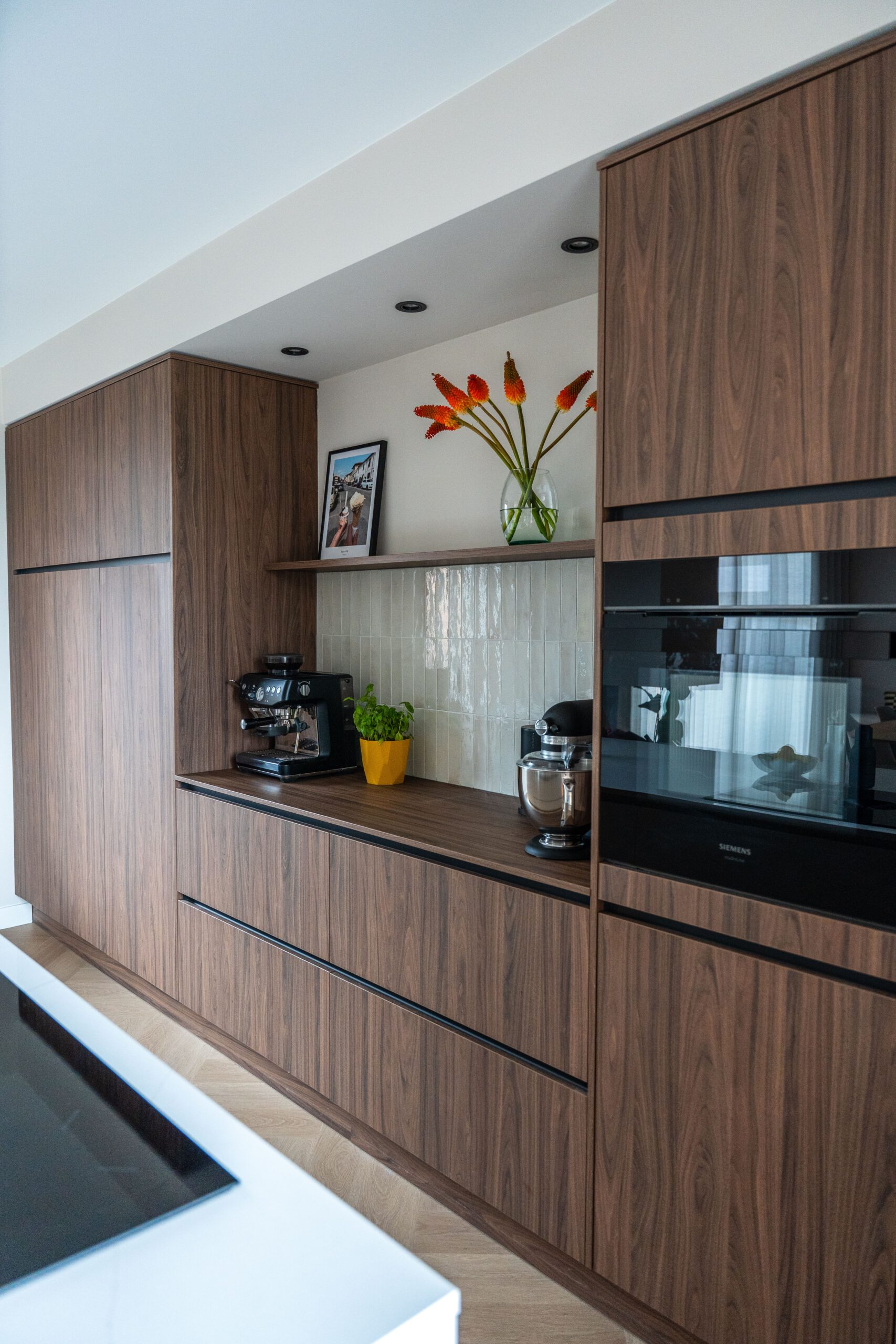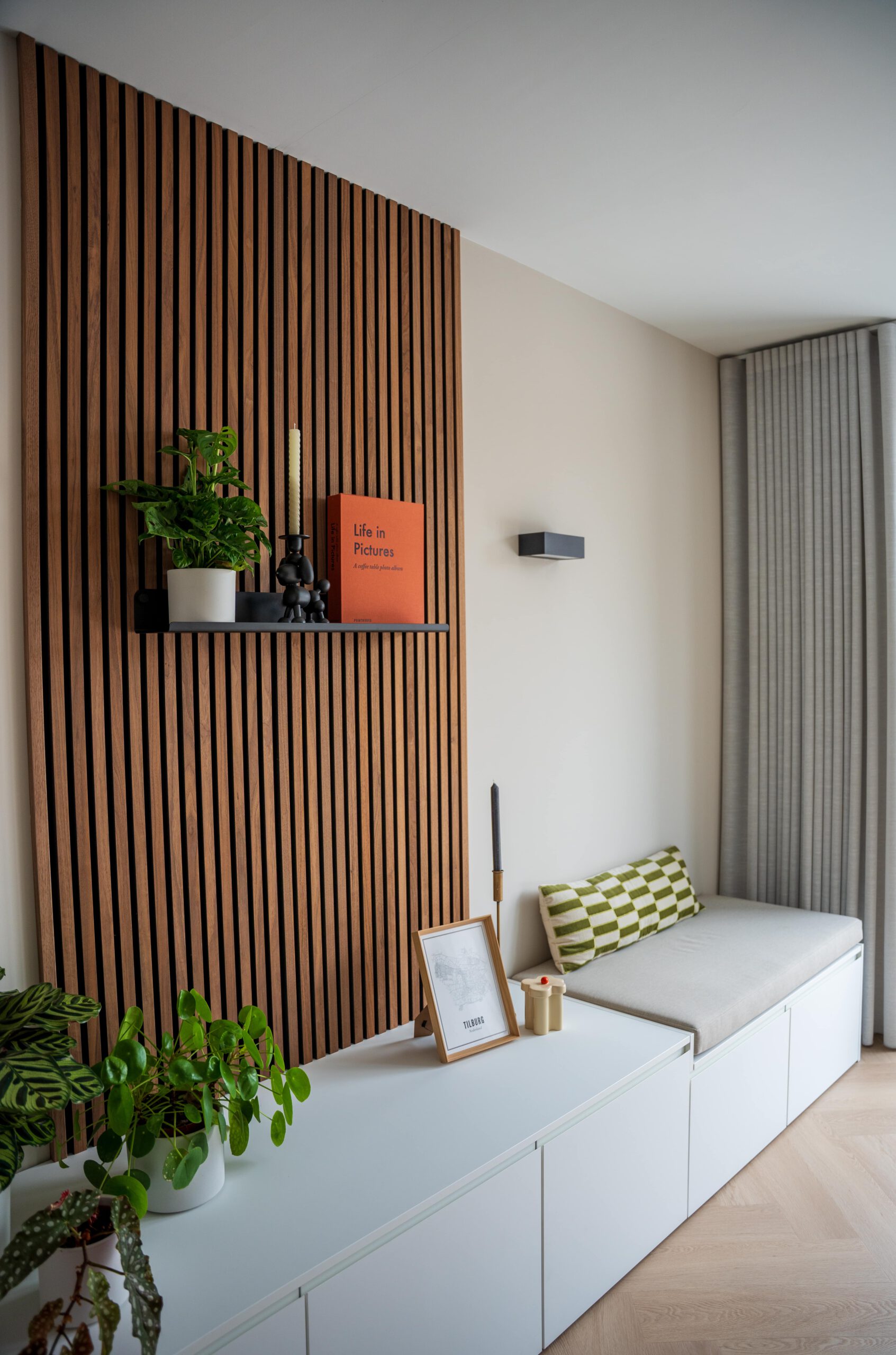 De wens om genoeg kastruimte en een extra zitplekje te creëren wordt gerealiseerd door de maatwerk lage kast. Ik heb hier gekozen voor een kast over de volledige breedte, zodat dit in balans is met de hoge keuken kastenwand aan de tegenoverliggende muur. De houten panelen geven de kast meer body en zorgen ook nog eens voor een verbeterde akoestiek, wat fijn is in een grote ruimte. De wandlampen zorgen voor extra sfeer en dragen bij aan een goed lichtplan in de leefkeuken.