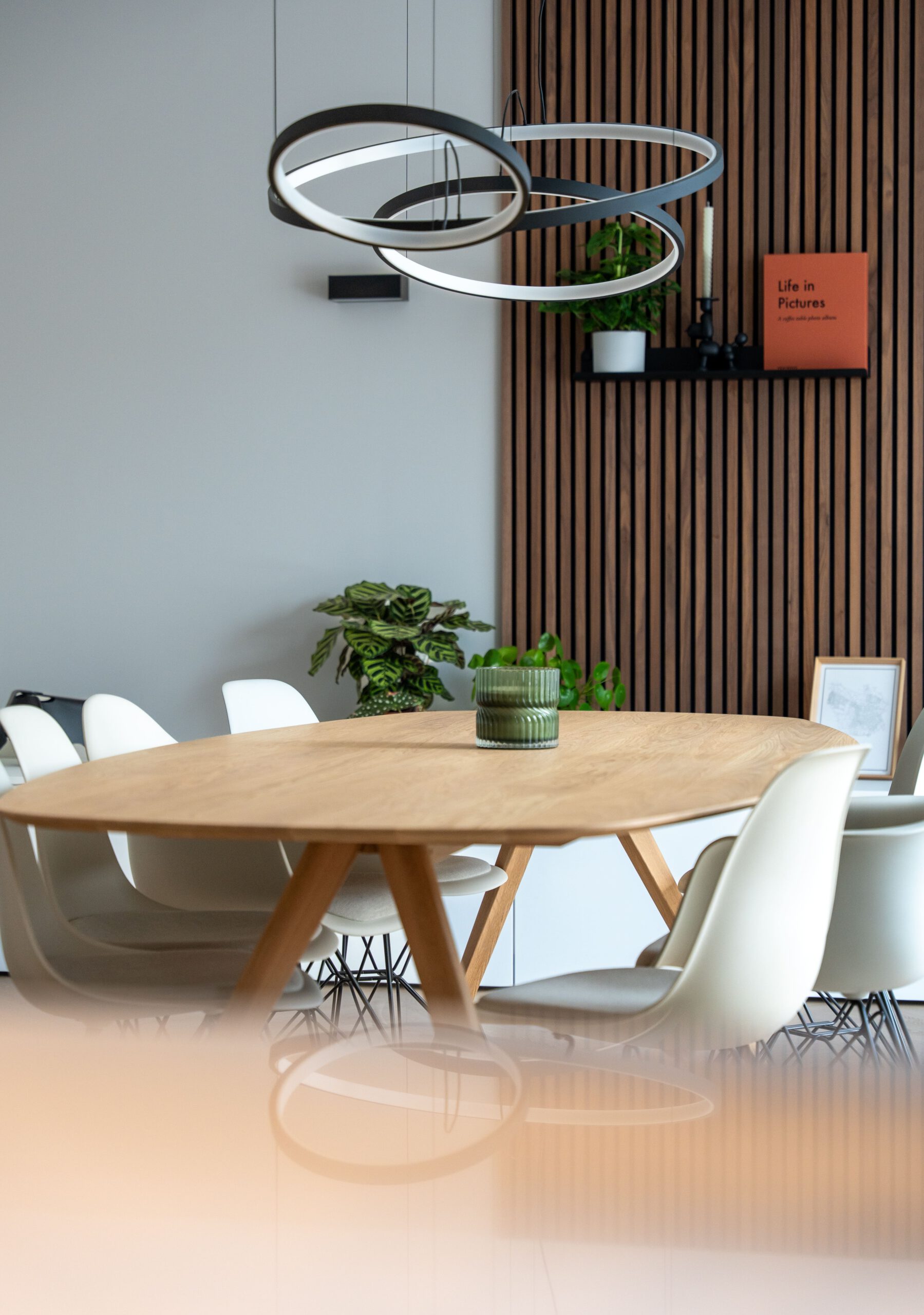 Een Deens ovale eettafel en stoelen met ronde rugleuningen zorgen voor zachtheid in de ruimte. De eettafel staat haaks op de kastenwanden en het kookeiland zodat niet alles ‘in een rijtje’ is geplaatst.