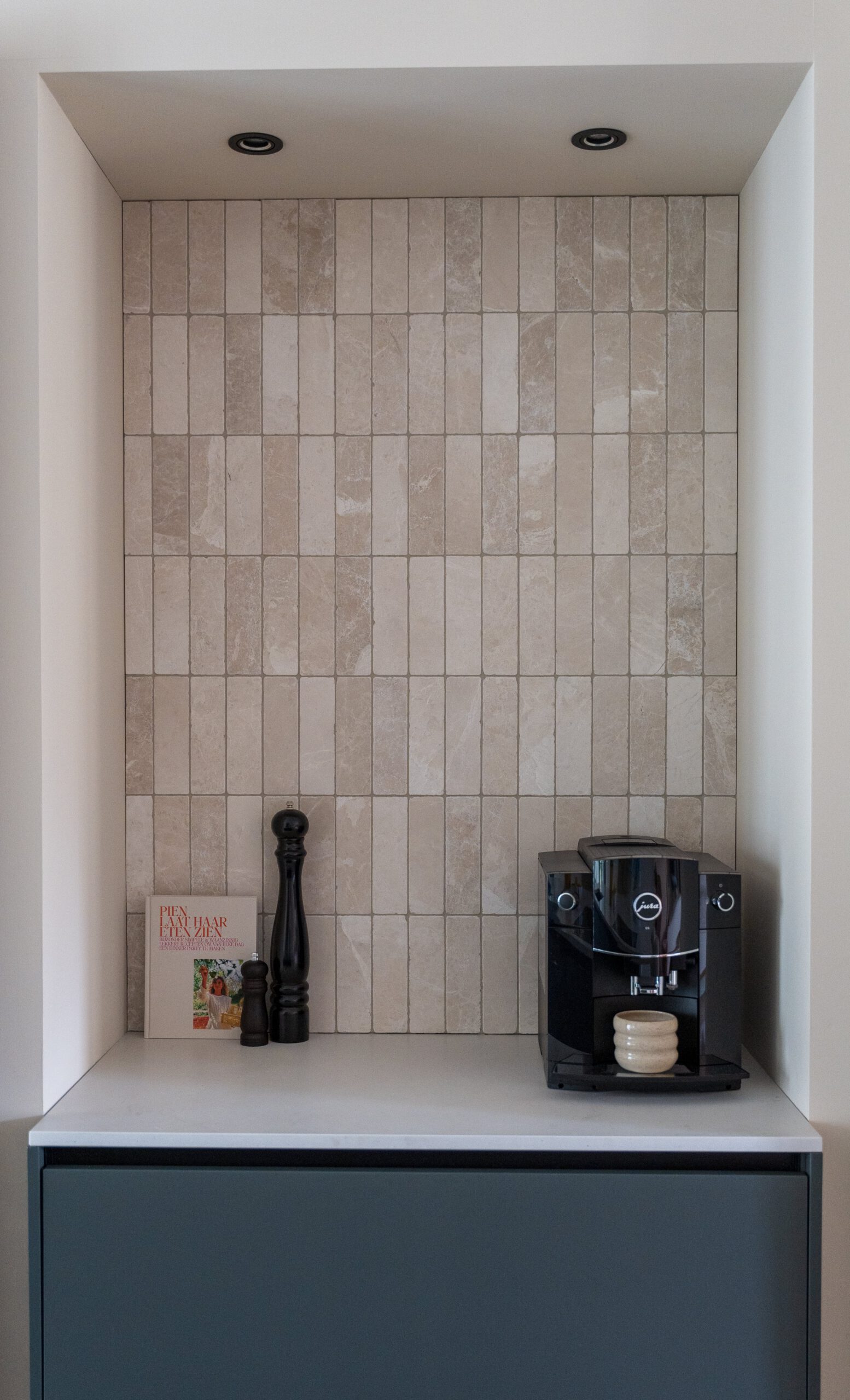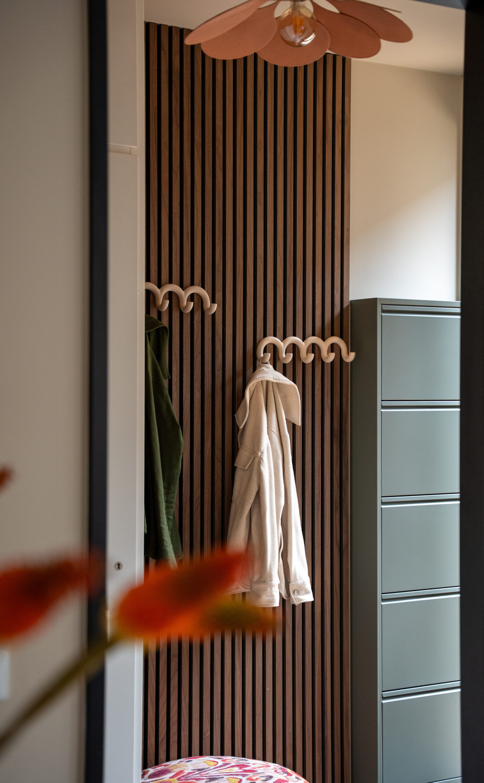 Door vanaf het begin goed na te denken over kleurgebruik en materiaalkeuzes, ontstaat er samenhang en rust in de woning. We hebben gewerkt met natuurlijke tinten en een mix van structuren – denk aan hout, zachte stoffen, tegeltjes en een subtiel accent van metaal – om diepte en warmte toe te voegen. Het combineren van verschillende materialen zorgt voor spanning en karakter waardoor de ruimtes een eigen verhaal vertellen.