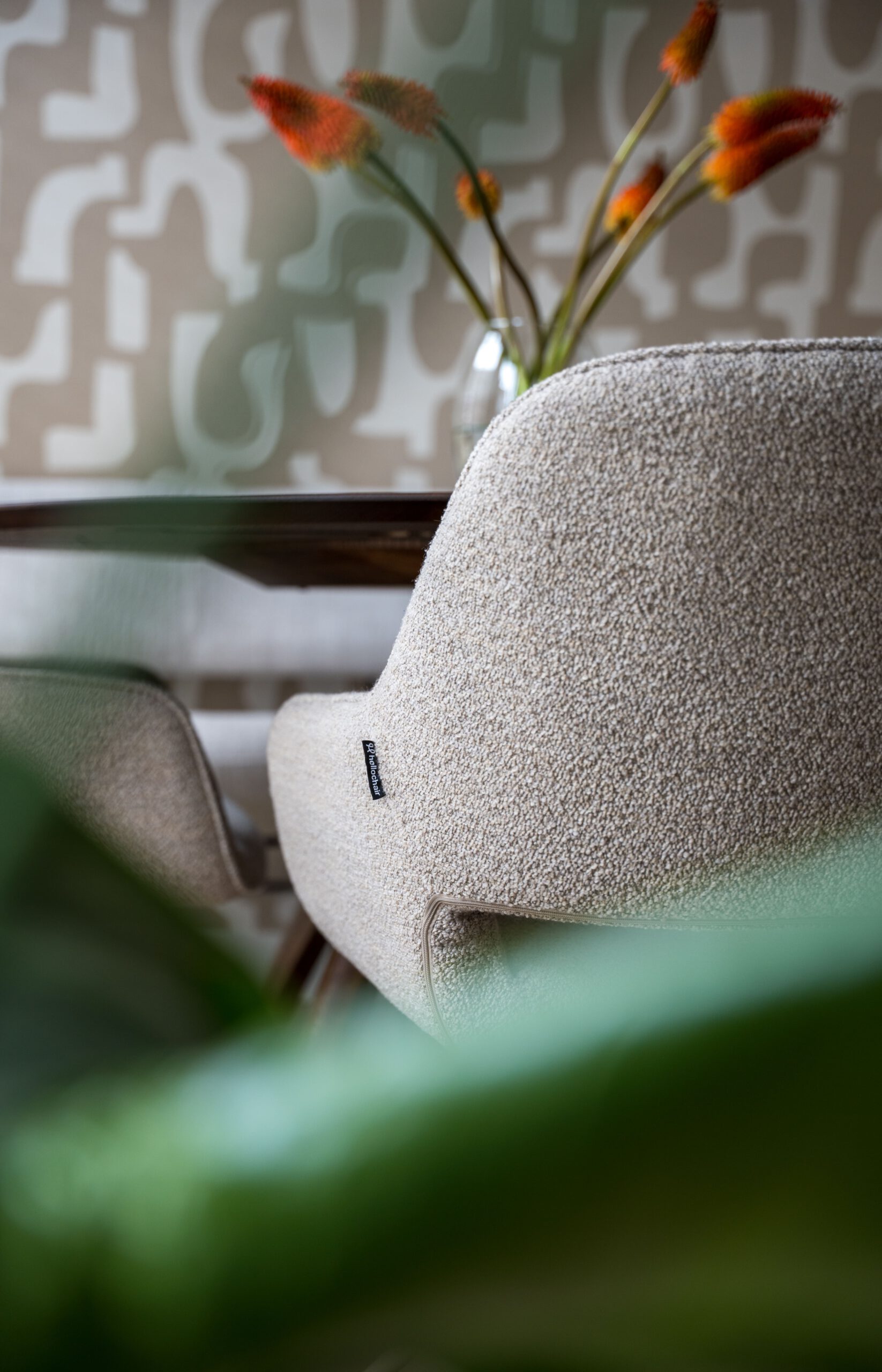 Het zorgvuldig kiezen van het juiste formaat bank en eettafel was in beide gevallen cruciaal: te klein zou verloren ogen in de ruimte, terwijl te groot de luchtigheid en functionaliteit zou wegnemen.